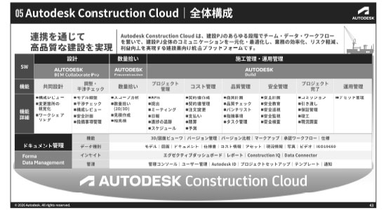 ACCは「ISO19650」をサポートしている「Autodesk Docs」をプラットフォームとしてCDEを提供し、設計、施工を、オートデスク社の複数のソリューションによって、管理する。